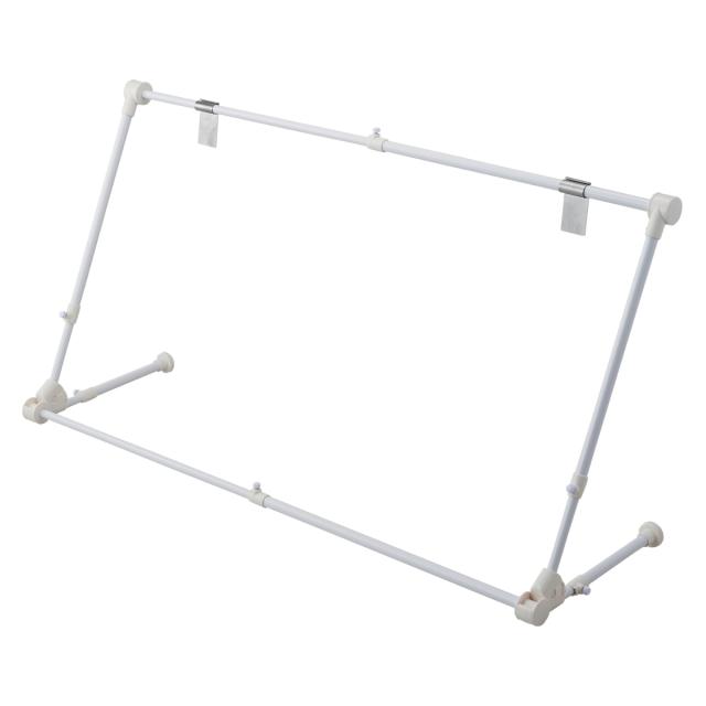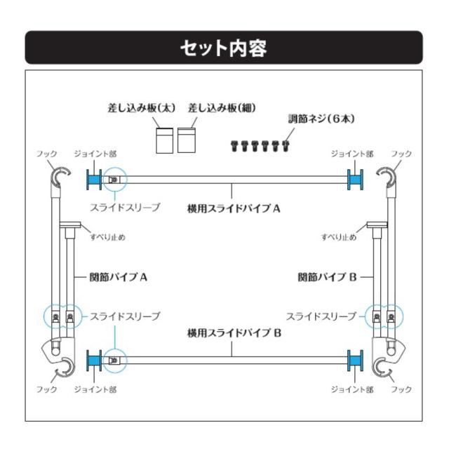 | 材質 | パイプ:ABSコーティングスチールパイプ フック・ジョイント部・スライドスリーブ:ABS樹脂 差し込み板:ステンレススチール すべり止め:TPE 調節ネジ:ユリヤネジ |