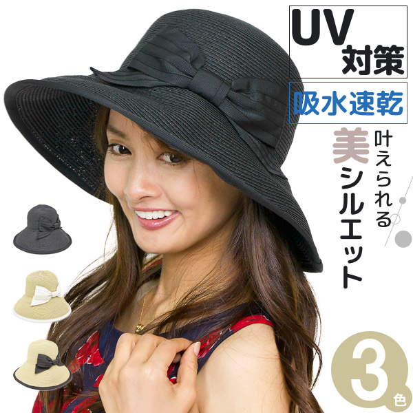 女性らしい可愛くて品のあるシルエットに加え、使用時にしっかりと紫外線から守ってくれる、機能性が充実したキャペリンハットのご紹介です。最大の魅力は、ツバに90%の遮蔽率があり、女性の大敵紫外線からしっかりガードしてくれるところ。また汗にも強く、内側スベリには『激サラッ』シリーズの吸水速乾素材を使用していますので、嫌なベタ付き感もなく、真夏日でも快適に着用していただけます。華やかに見えるグログランリボンを大きく合わせた、派手すぎずとても愛らしいデザインが魅力です。