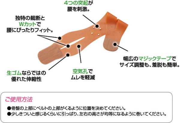 遠赤外線指圧と天然生ゴムのW効果で骨盤をしっかりサポートします。体を温める遠赤外線灸が背中部分についています。生ゴムのすぐれた伸縮性と独自の裁断加工で、体にぴったりフィットし、骨盤をしっかり守ります。男女兼用で、着脱も簡単。【適応サイズ】S〜M:ヒップ80〜92cm/M〜L:ヒップ93〜105cm/L〜LL:ヒップ105〜120cm【製品サイズ】S〜M:82×16cm/M〜L92×16cm/L〜LL:103×16cm【素材】ベルト:天然ゴム100% / 指圧灸:遠赤外線特殊樹脂【原産国】日本
