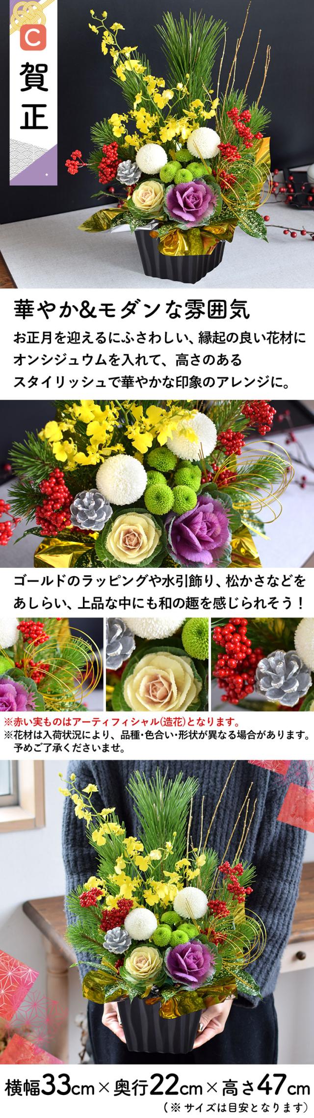 「賀正」:松/ピンポンマム/スプレーマム/葉牡丹/オンシジュウム/行李柳/グリーン/