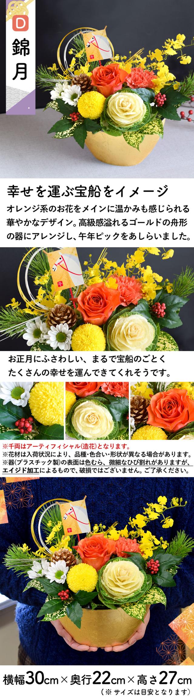 バラ/カーネーション/オンシジューム/菊/葉牡丹/アート千両(造花)/松/グリーン/ (器)プラスチック製フラワーベース/吸水性スポンジ/松かさピック/水引ピック/干支ピック/ ※フラワーベース(プラスチック製)の表面は色むら、微細なひび割れがありますが、 エイジド加工によるもので破損ではございません |