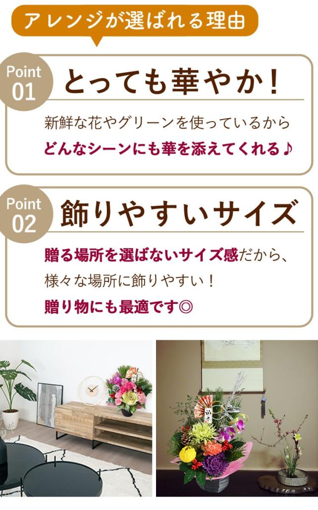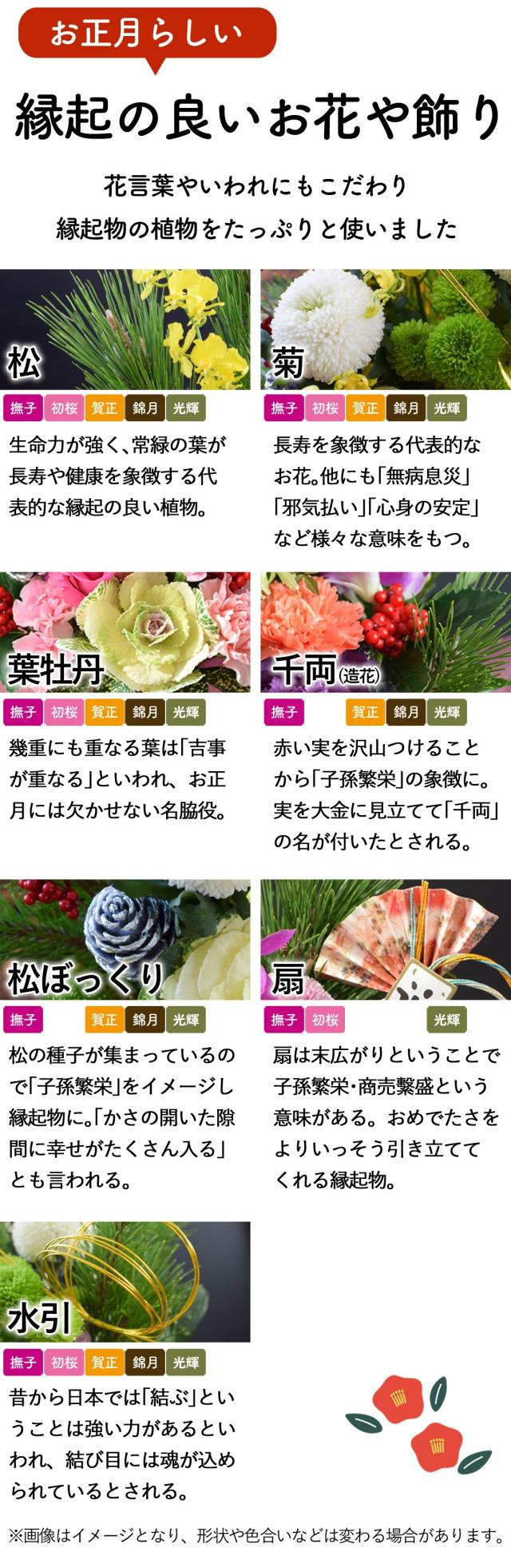 | 内容 | 松/バラ/モカラ/スプレーカーネーション/カーネーション/アート千両(造花)/マム/葉牡丹/ゴット/ (器)プラポット/水引/迎春扇ピックラタンボールピック//吸水性スポンジ/ |
