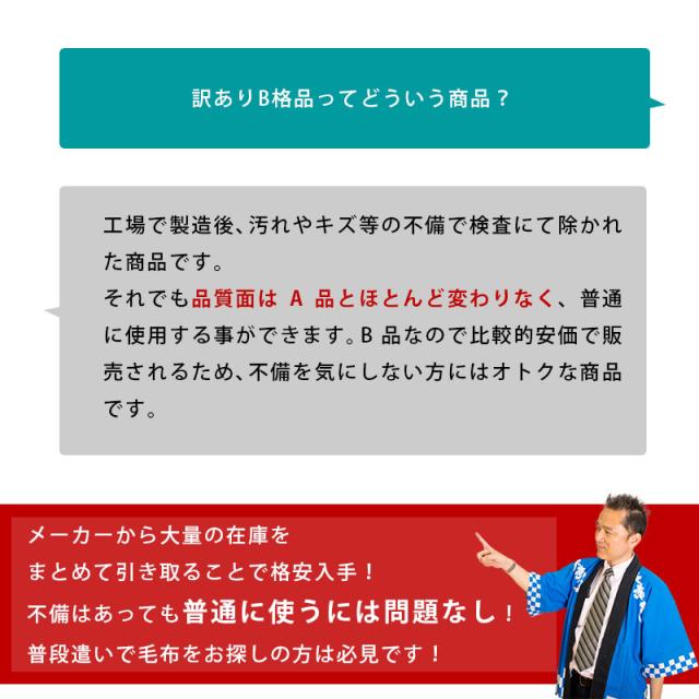 品質はそのまま、ちょっとした染料飛びや織りキズ、縫製ミスなんかでB格になった毛布を一括買取にて特別価格で入手できました。自分やご家族の普段遣いとして、おすすめです!