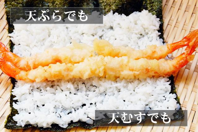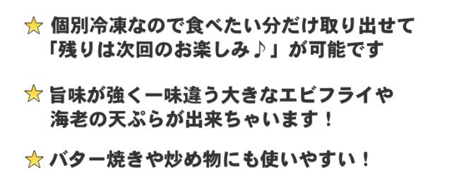 - 伸ばしてあるので解凍したら天ぷら粉をつけ、揚げるだけ。簡単にプリプリの海老天が出来上がります。
