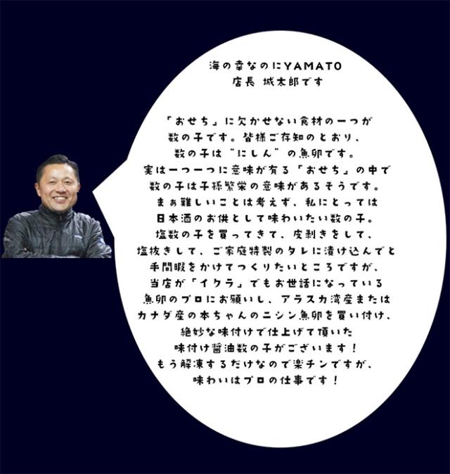 - 私は数の子 大好物で、色々な所で数の子購入しましたが、YAMATOさんの数の子は間違いない、一番美味しいです。ひとつひとつのサイズは小ぶりですが、私はこれくらいが好きだし、ビールのお供にパリパリ食べち...