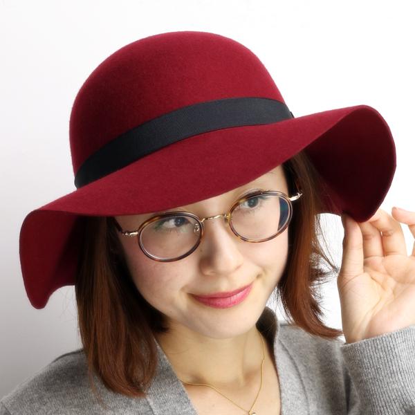 ハット フェルト レディース 女優帽 つば広 帽子 ガルボハット 秋冬 ウール ワイン ボルドー