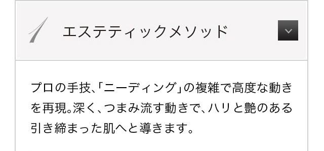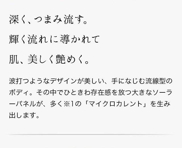 エステティックメソッド、マイクロカレント、プラチナムコート、防水構造で、深く、つまみ流す。 輝く流れに導かれて 肌、美しく艶めく。