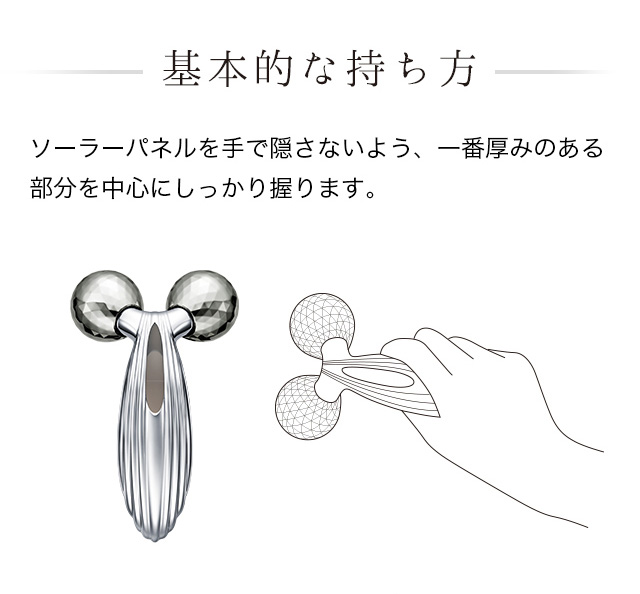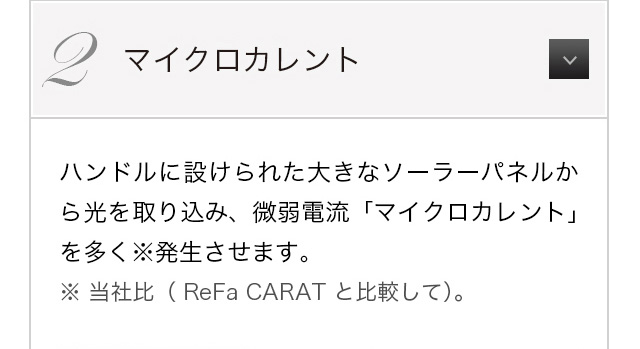 エステティックでも大人気の「マイクロカレント」。ReFaはソーラーパネルから光を取りこみ、微弱電流「マイクロカレント」を発生。