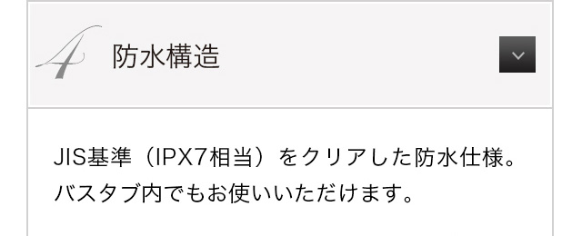 JIS基準(IPX7相当)をクリアした防水構造。バスタブ内でもお使いいただけます。