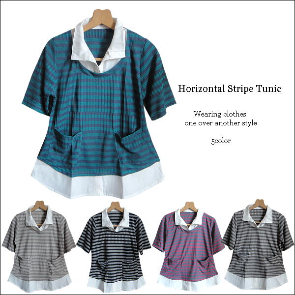 【クリックポスト対応可】ホワイトシャツ重ね着風トップス ボーダー グリーン 茶 ブラック ピンク カーキ M Lサイズ ストレッチ素材 春夏秋 半袖 レディース チュニック 半袖 特価 チュニック レディース 特価