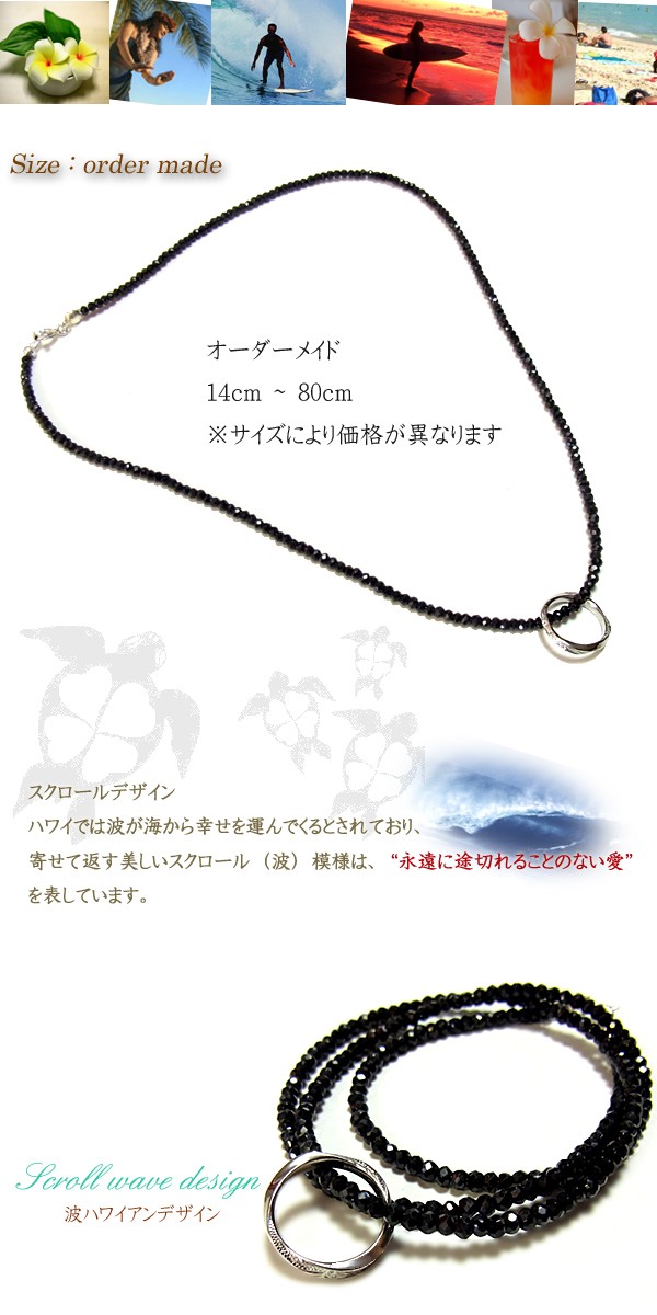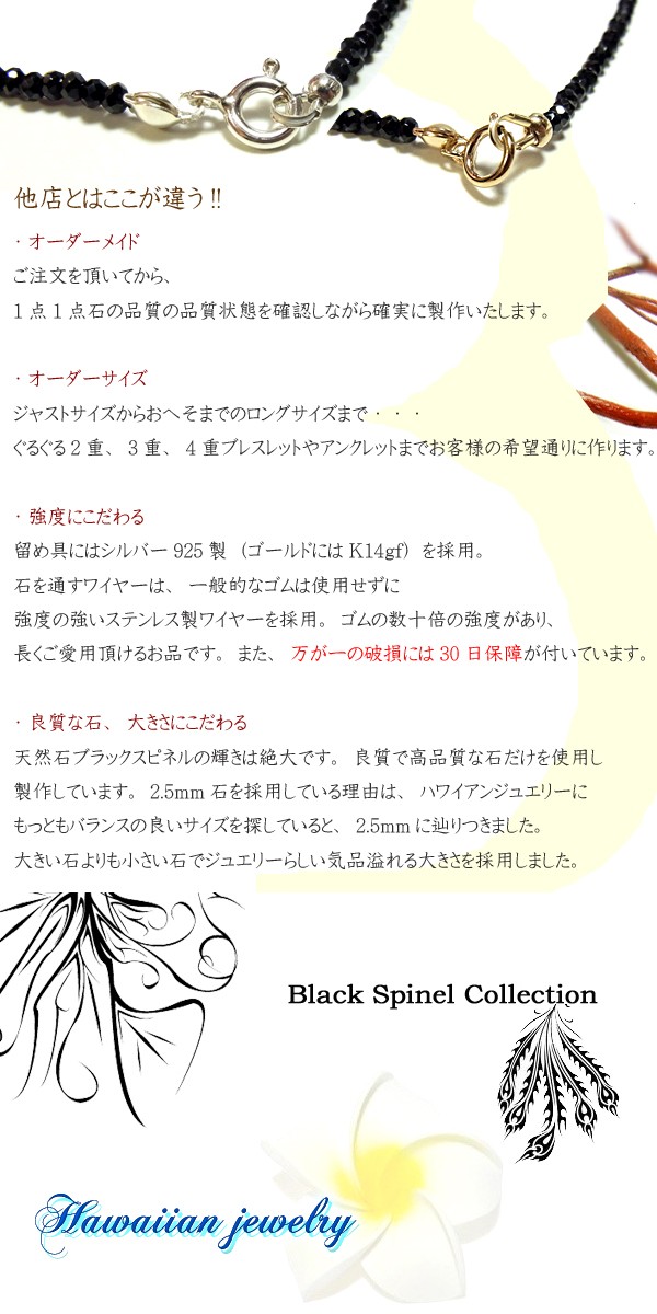 シンプルデザインが定評ハワイアンジュエリーにブラックダイヤに匹敵する輝きを放つブラックスピネルネックレスを合わせました。14cm(ブレスレット)〜 80cm(ロングサイズ)まで自由にご指定頂けます♪