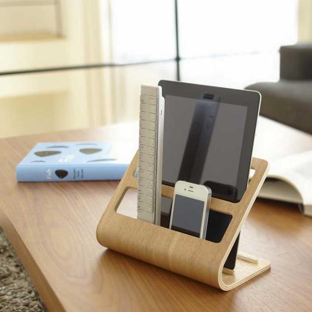 上品な木目のゆるやかなカーブが美しいタブレット&リモコンラック。
