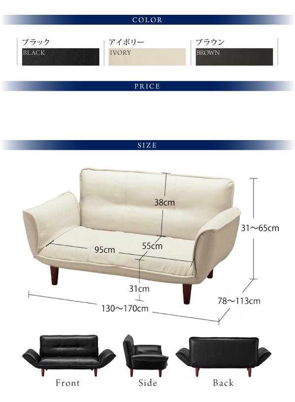 2P:幅130〜170(95)×奥行き78〜113(55)×高さ31〜65(31)cm