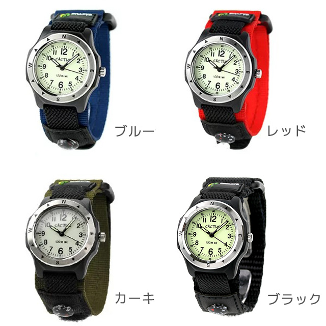 カクタス キッズ クオーツ 子供用 腕時計 CAC-65 CACTUS 選べるモデル カクタスは子供の目線で企画された、オーストラリア発信のキッズウォッチのブランドです。カラーリング・デザインも子供たちが好きなものをたくさん取り入れ、ワクワクする時計を数多くラインナップ。おしゃれなアクリルケースに入ってますので、プレゼントにも喜ばれます。子供たちの世界感をイメージして作られたカクタスは世界中のたくさんの子供たちに人気です。 元気な男の子にピッタリのミリタリーテイストが特徴のモデル。暗闇でも時間を確認できる文字盤全面蓄光タイプ。 ブルー CAC-65-M03 レッド CAC-65-M07 カーキ CAC-65-M12 ブラック CAC-65-M01