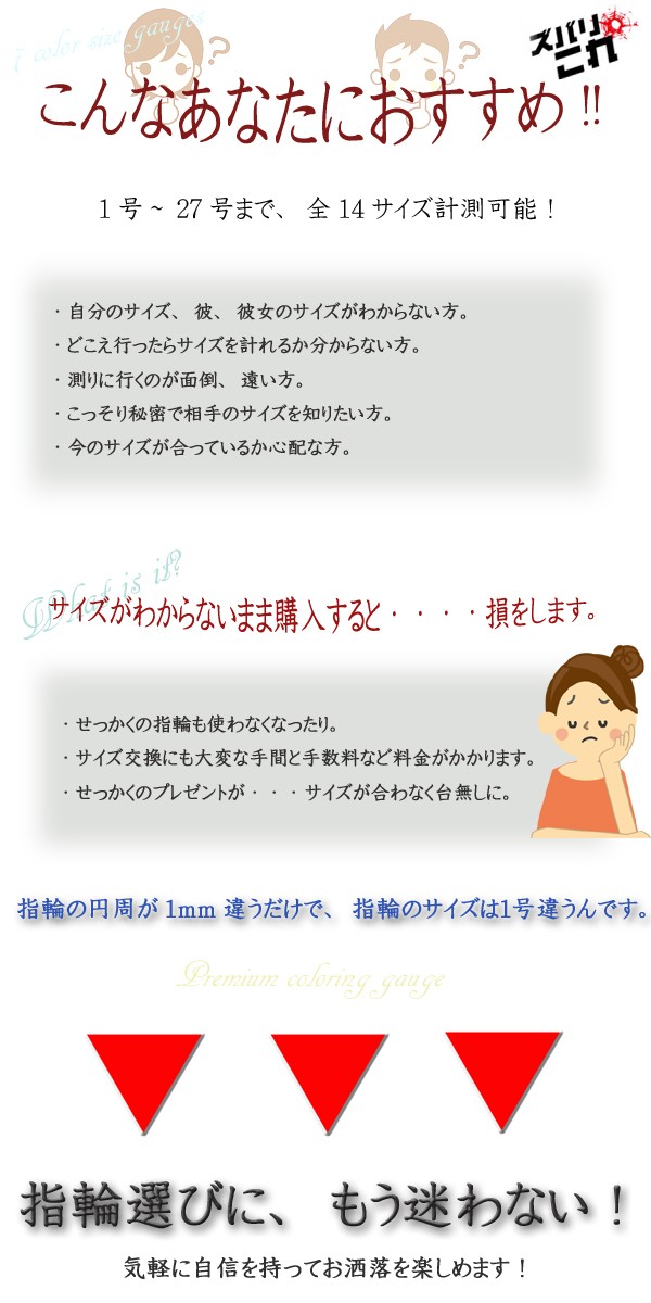 - 自分の指輪のサイズが分かるので これからは色んな指にちゃんと合わせたリングを買う事が出来ます。