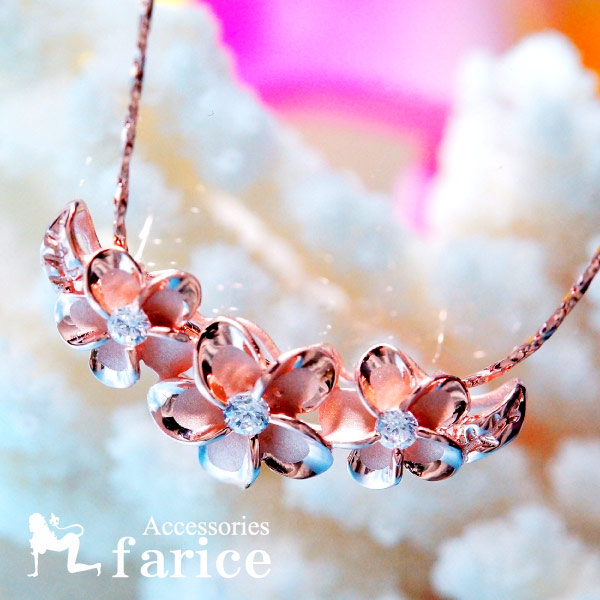 ★(長さ約45cm×幅約0.8mm)スウェッジスクリューチェーン付き♪ ★華やかでトロピカルな雰囲気たっぷりの3連プルメリア&2リーフデザイン♪ ★ピンクゴールドの彩りが女性らしい可憐な魅力をさらにパワーアップ! ★クリアキュービックジルコニア付きでキラキラ感も十分!★プレゼントにもぜひオススメです♪