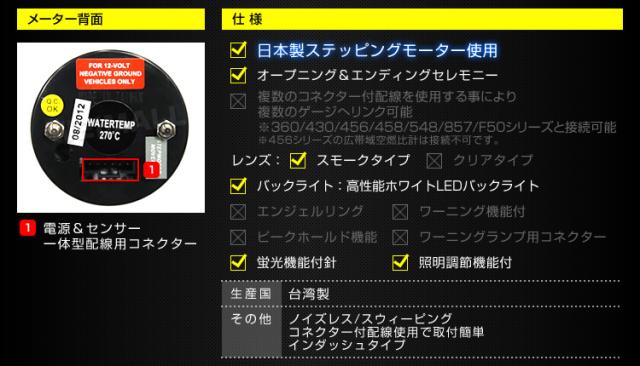 | 商品仕様 | モーター仕様:日本製ステッピングモーター メーター径:52mm ライト:高性能ホワイトLEDバックライト レンズ:クリアレンズ フルスウィープ:270度 ノイズレス/スウィーピング コネクター付配線使用で取り付け簡単 蛍光機能付針 オープニングセレモニー(イグニッションをONにすると針が1度MAXまで移動) エンディングセレモニー(イグニッションをOFFにするとフェードアウトしながら消灯) ※インダッシュ・タイプの為、取り付け台の別途購入が必要 |