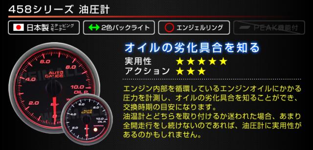 油圧計 オートゲージ 車 60mm 60Φ 精度誤差約±1%! メーター スモークレンズ 追加メーター 後付け Autogauge 日本製モーター エンジェルリング 2色バックライト ワーニング機能 458シリーズ 送料無料