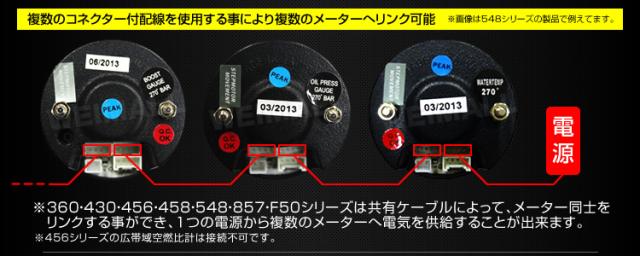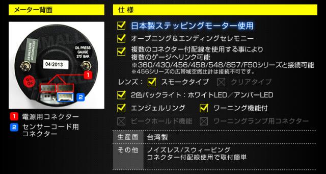 | 商品仕様 | メーター径60mm 日本製ステッピングモーター 2色バックライト:ホワイトLED/アンバーLED エンジェルリング スモークレンズ ノイズレス/スウィーピング 複数のコネクター付配線を使用する事により複数のゲージへリンク可能 コネクター付配線使用で取り付け簡単 オープニングセレモニー(イグニッションをONにすると針が1度MAXまで移動) エンディングセレモニー(イグニッションをOFFにするとフェードアウトしながら消灯) ワーニング値:0.75 Bar以下 ※商品コード 430/458/548/F50と接続可能 |