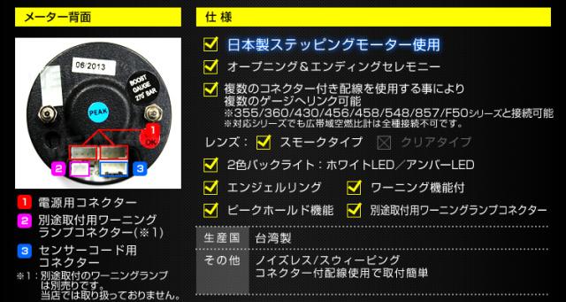 | 商品仕様 | メーター径52mm 日本製ステッピングモーター 2色バックライト:ホワイトLED/アンバーLED エンジェルリング ワーニング機能付 PEAK機能付 スモークレンズ ノイズレス/スウィーピング 複数のコネクター付配線を使用する事により複数のゲージへリンク可能 コネクター付配線使用で取り付け簡単 オープニングセレモニー(イグニッションをONにすると針が1度MAXまで移動) エンディングセレモニー(イグニッションをOFFにするとフェードアウトしながら消灯) ※商品コード 430/458/548/F50と接続可能 |