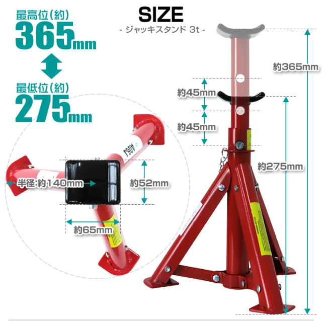 | 商品仕様 | 能力:3t 高さ調節:3段階 ・最低位(約):275mm ・最高位(約):365mm 重量(約):3.25kg(2基) |
