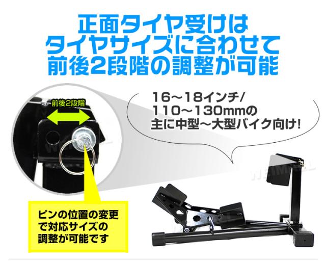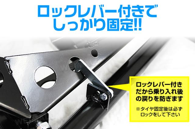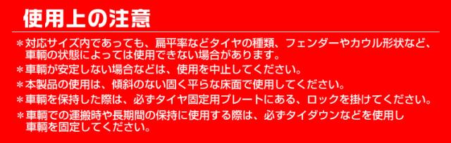| 注意事項 | ・簡単な組立式です。 ・対応サイズ内であっても、扁平率などタイヤの種類、フェンダーやカウル形状など、車輌の状態によっては使用できない場合があります。 ・本製品の使用は、傾斜のない固く平らな床面で使用してください。 ・車での運搬の際には転落防止のため、タイダウンベルト等と併用でしっかり固定してください。 |
