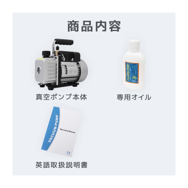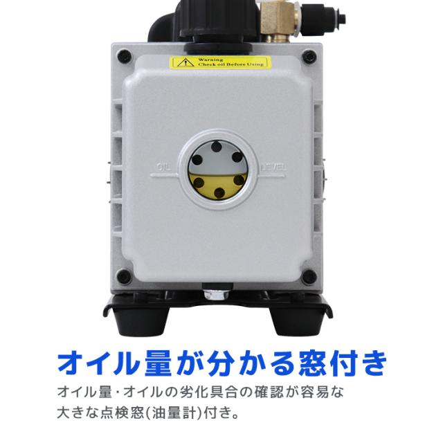 | 仕様 | ローター方式:シングルステージ式 到達真空度:75ミクロン(10pa) 排気速度:30 l/min(50Hz)、36 l/min(60Hz) 電源:AC100V(AC110V) 50Hz/60Hz 消費電力:120W 回転数:1440rpm(50Hz)、1720rpm(60Hz) 吸気口径:1/4"フレア(UNF7/16-20) サイズ(約):245×120×215mm 重量(約):5kg 逆流防止:あり オイル封入量:160ml |