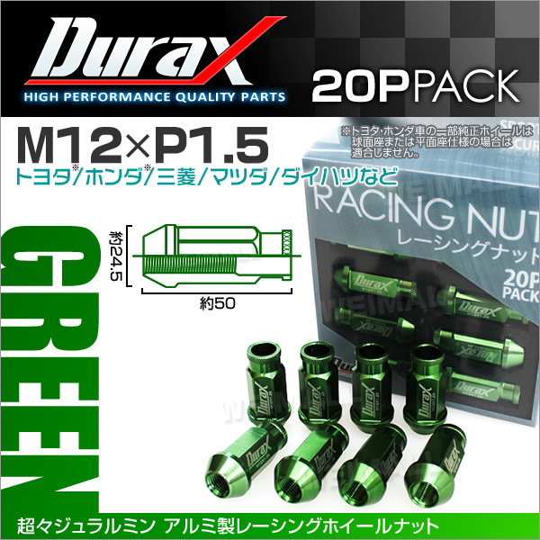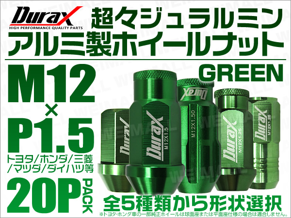 アルミホイールナット ナット 軽量 ホイールナット M12 P1.5 レーシングナット 貫通ナット ロングタイプ 20個セット 緑