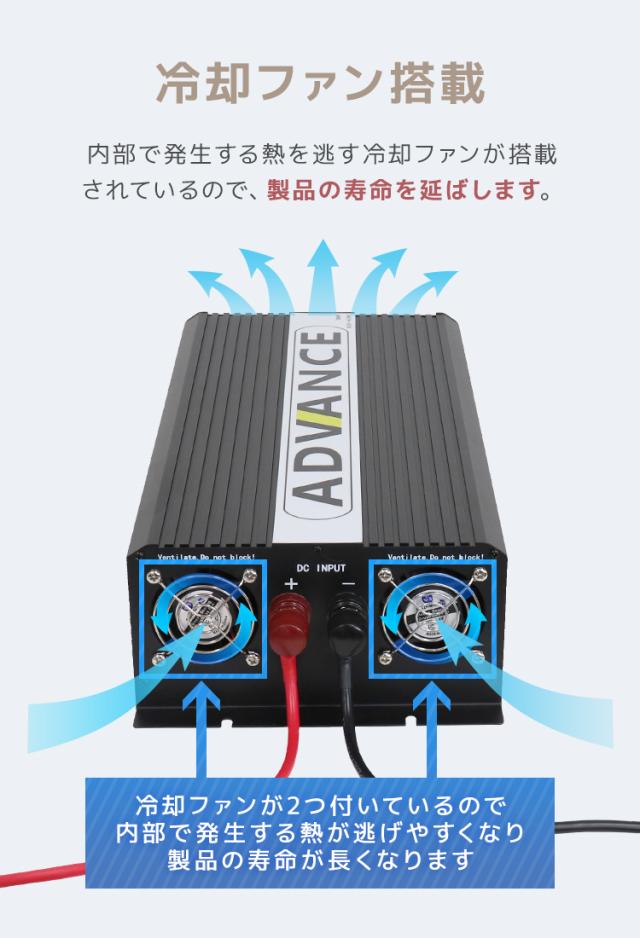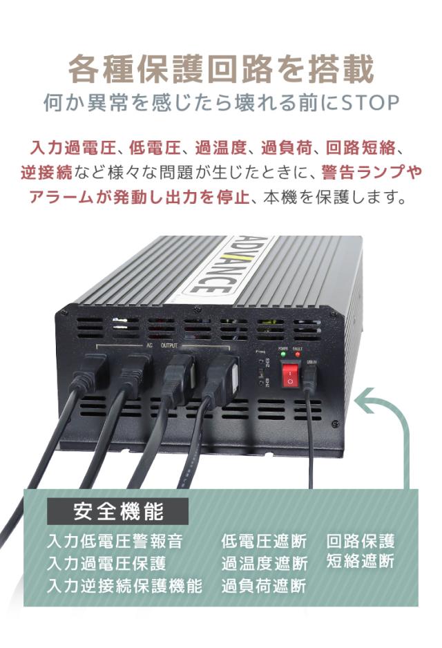 | 商品機能 | 回路保護 入力低電圧警報音 低電圧遮断 過温度遮断 過負荷遮断 短絡遮断 入力過電圧保護 入力逆接続保護機能 |