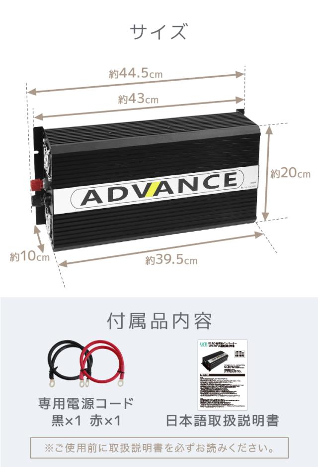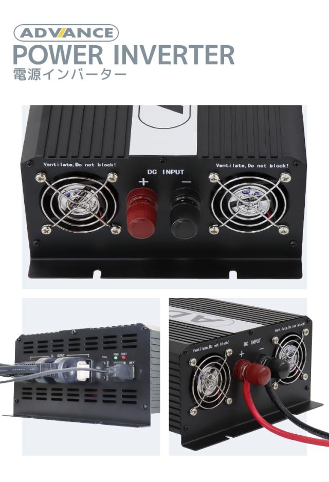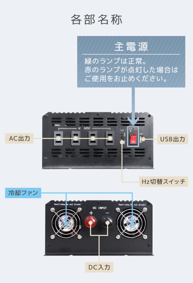 | 商品仕様 | 寸法:430mm(L)×200mm(W)×100mm(H) AC100Vコンセント ×4 USBポート ×1 入力電圧:DC24V 出力電圧:AC100V 定格出力:2000w 最大出力:4000w 出力周波数:スイッチで50Hz/60Hz 変換可能 出力波形:矩形波(疑似正弦波) ケース:アルミ製 |