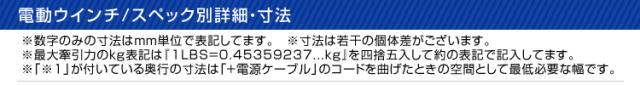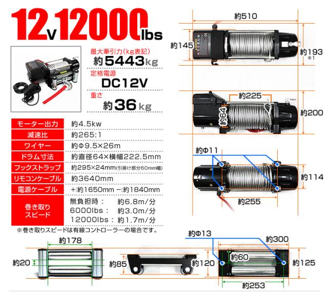 | 商品仕様 | 巻き上げ重量:12000LBS(5443kg) 定格電圧:DC12V ギア比:265:1 モーター:永久磁石 4.5kw ケーブル(約):直径 9.5mm、長さ 26m ドラムサイズ(約):直径 64mm、長さ 222.5mm サイズ(約):長さ510×幅193×高さ200mm 重量(約):36kg 防水仕様 |