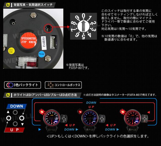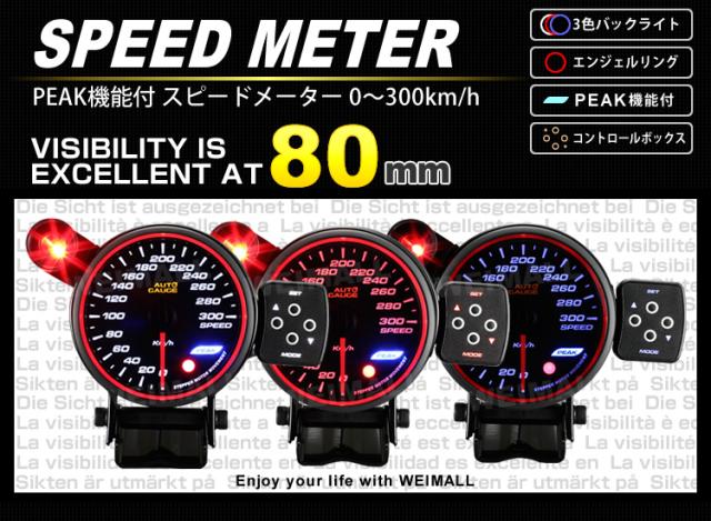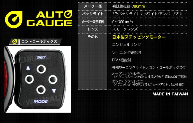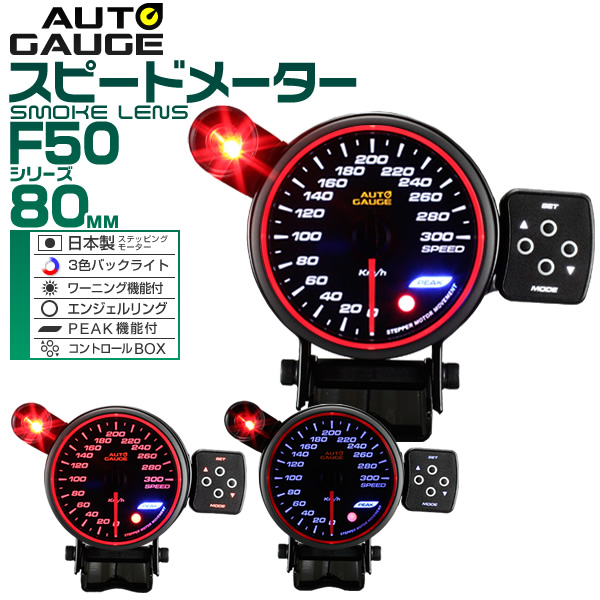 オートゲージ スピードメーター 80mm 80Φ 精度誤差約±1% エンジェルリング スモークレンズ 追加メーター 後付け Autogauge 日本製モーター エンジェルリング LED 3色バックライト ワーニング機能 ピークホールド機能 改造 ドレスアップ F50シリーズ 送料無料