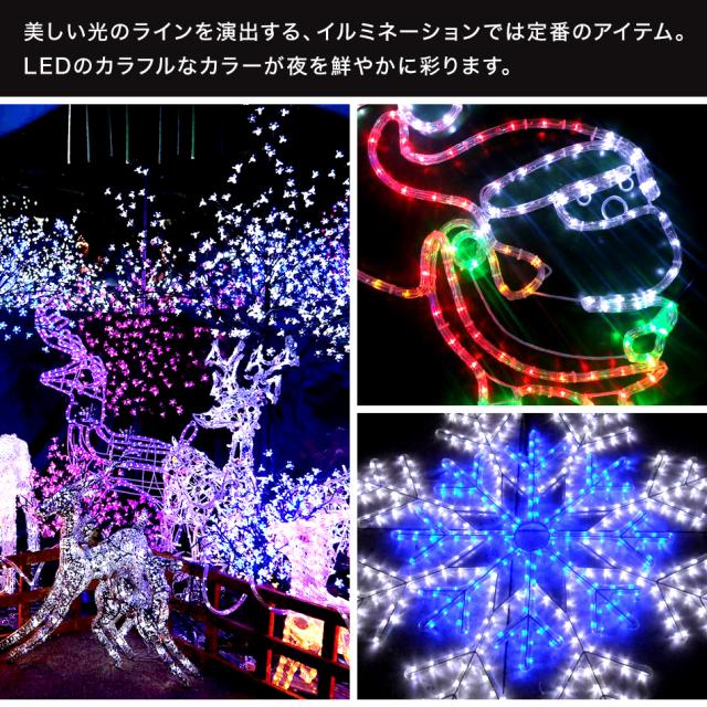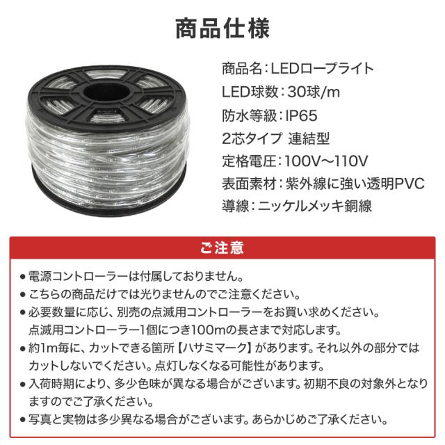 | 仕様 | カラー:ブルー、グリーン、オレンジ、ピンク、レッド、ホワイト、シャンパン、イエロー、ミックス LED球数:30球/1m 防水等級:IP65 2芯タイプ 連結型 長さ:50m 定格電圧:100V?110V 表面素材:紫外線に強い透明PVC使用 導線:ニッケルメッキ銅線使用 |