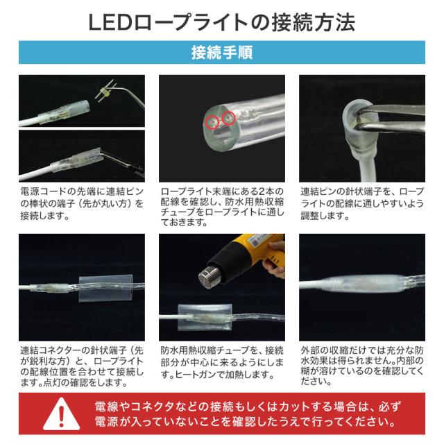 | 注意事項 | ・電源コントローラーは付属しておりません。 ・こちらの商品だけでは光りませんのでご注意下さい。 ・必要数量に応じ、別売の電源コントローラーをお求め下さい。(電源コントローラー1個につき100mの長さまで対応します) ・約1m毎に、カットできる箇所【ハサミマーク】があります。それ以外の部分でカットしないで下さい。点灯しなくなる可能性があります。 ・接続箇所の2本のピンには挿す向きがあります。もし点灯しない場合は2本のピンを逆向きに挿し直してお試し下さい。 ・入荷時期により、多少色味が異なる場合がございます。初期不良対象外となりますのでご了承下さい。 ・写真と実物は多少異なる場合がございます。あらかじめご了承下さい。 ・商品は、モニターによって色合いが異なって見える場合があります。 ・仕様・デザインは改良のため予告なく変更することがあります。 |