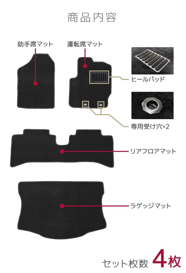 | 内容 | 4Pセット ・運転席マット×1 ・助手席マット×1 ・リアフロアマット×1 ・ラゲッジマット×1 |