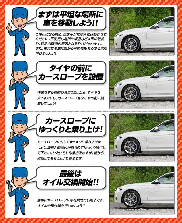 | 注意事項 | ・安全に作業するため、スロープで乗り上げた後はカーストッパー等を使用して確実に車両を固定して下さい。耐荷重を超えてのご使用は大変危険ですのでお止め下さい。 ・箱がつぶれている場合もございますが商品に問題はありません。 ・海外製品で、簡易梱包での輸入のため商品に擦れや多少の小キズなどがある場合がございますが、商品自体には問題ありませんのでご了承下さい。 ・仕様・デザインは改良のため予告なく変更することがあります。 ・当商品を使用した場合に事故・破損が発生した場合は責任を負いかねますので予めご了承ください。 |