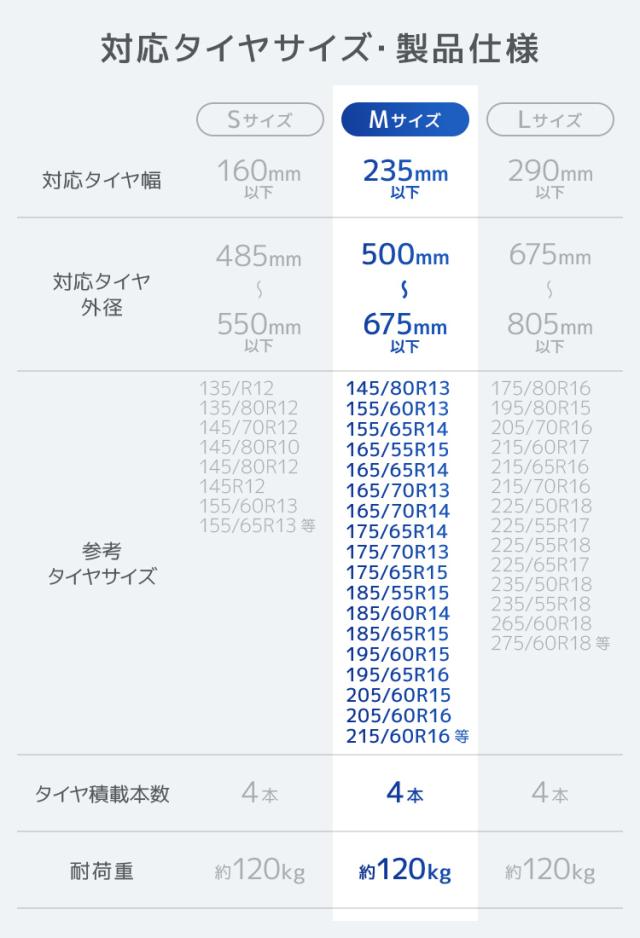 | 適合タイヤサイズ | タイヤ幅 235mm以下、外径 500〜675mm |