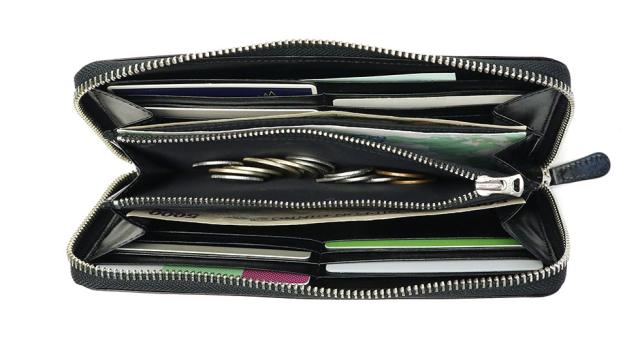 収納部は両サイドにマチを設けてラウンドファスナー仕様にすることで、中身が見やすく取り出しもスムーズに。充実した仕切りや15か所のカードポケットで分類された中身は、必要な物をたっぷり収納できるだけでなく、開けたときに一目で確認することができます。