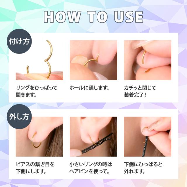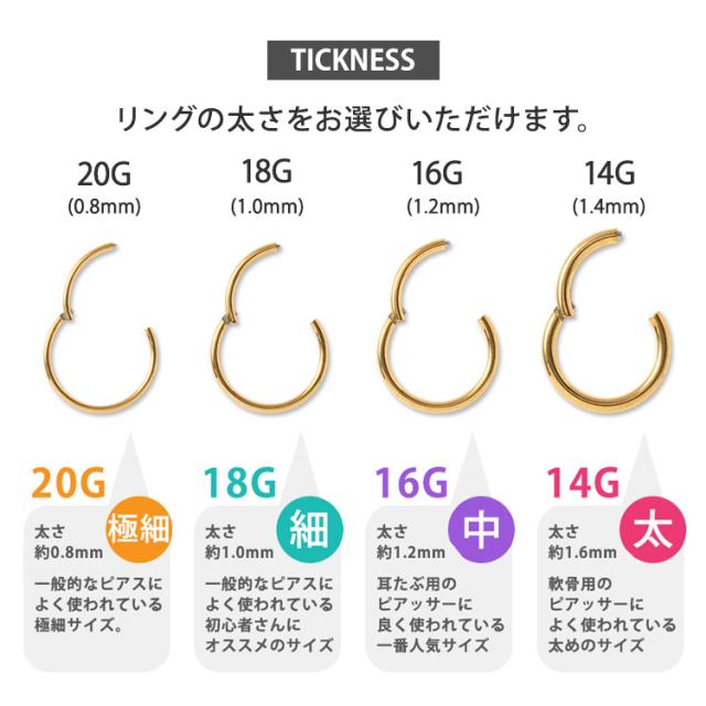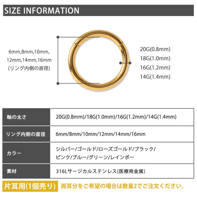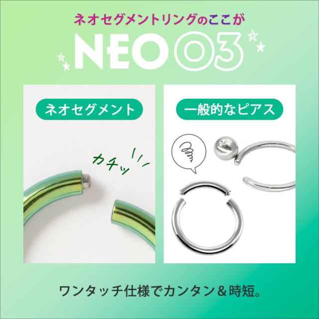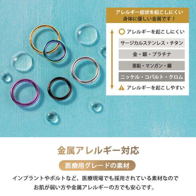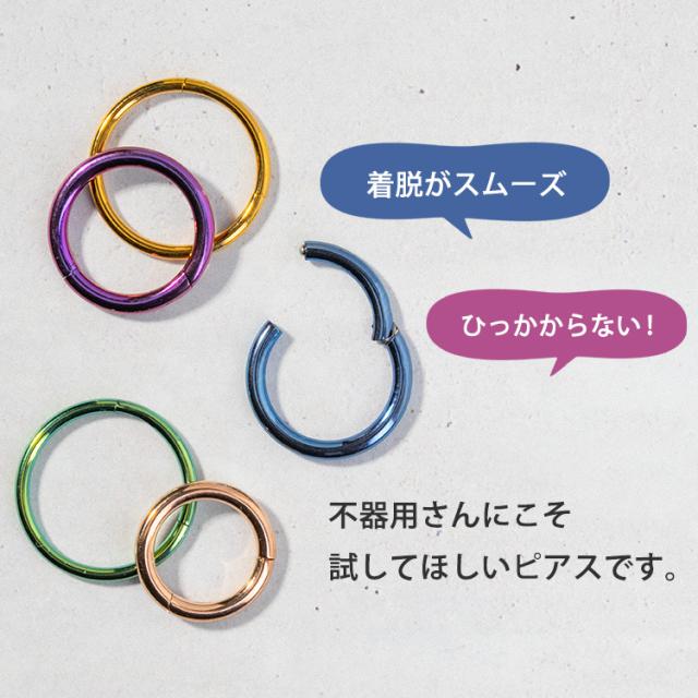 シンプル・イズ・ベストで使いやすいネオセグメントリング。パチッとワンタッチで着脱でき、片側は固定されているのでキャッチを失くす心配もありません。ピアスの素材には、金属アレルギーでも安心の医療用素材"316Lサージカルステンレス"を採用。時間が経っても変色や変形しにくく、金属の輝きが色褪せません。カラーはシルバー、ゴールド、ローズゴールド(ピンクゴールド)、ブラックのほかピンクやブルー、グリーン、レインボーなどのポップなカラーも取り扱っております。太さのサイズも20G、18G、16G、14Gの4サイズよりお選びいただけます。