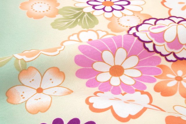はんなりとしたぼかしの地に、菊や桜の花が描かれています。