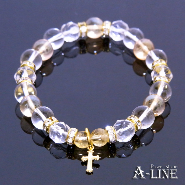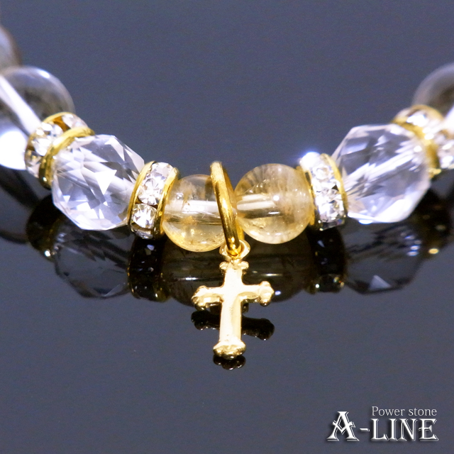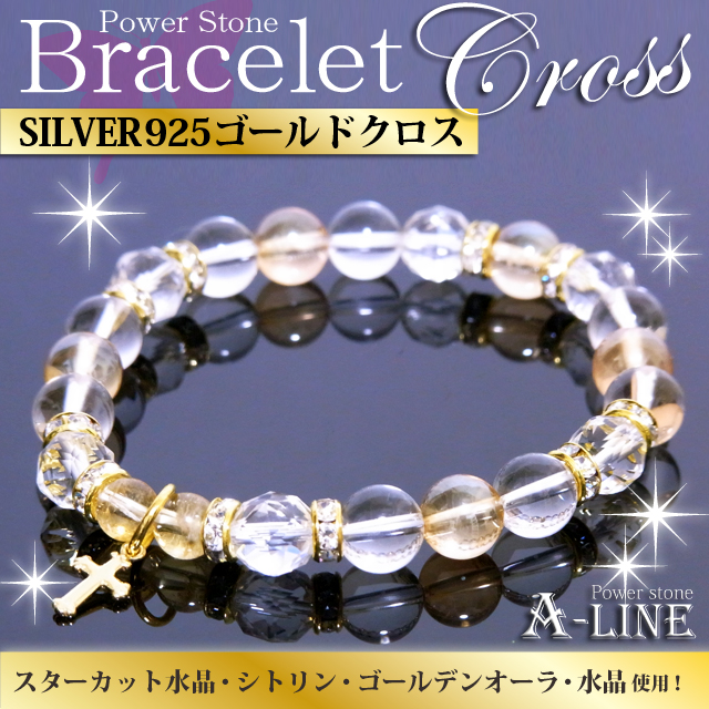 SILVER925製のゴールドクロスチャームをブレストップにしながら、金運石のゴールデンオーラクリスタルを使用!スターカット水晶を使用し、シトリン6mmを使った高級ブレスレット!