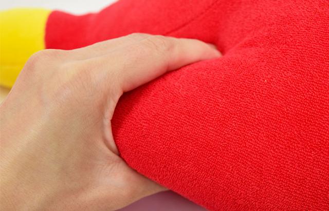 | ▲本体は、タオルのようなパイル地のやさしい肌ざわり。 パイル部分は、綿100%でできています。 ほどよい弾力があるので、抱きしめるのにピッタリ♪ 手洗いでお洗濯することができるので、汚れてしまっても安心です。 |