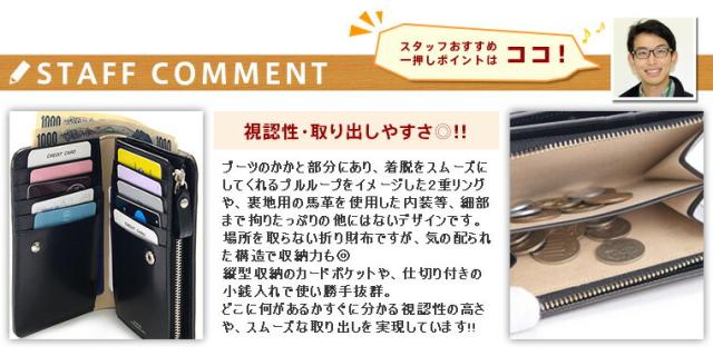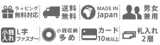 | 備考 | 【メイン開閉】ホック 外側/ L字ファスナー小銭入れ×1 内側/ 札入れ×1(二層式) カードポケット×10 フリーポケット×2 | ||