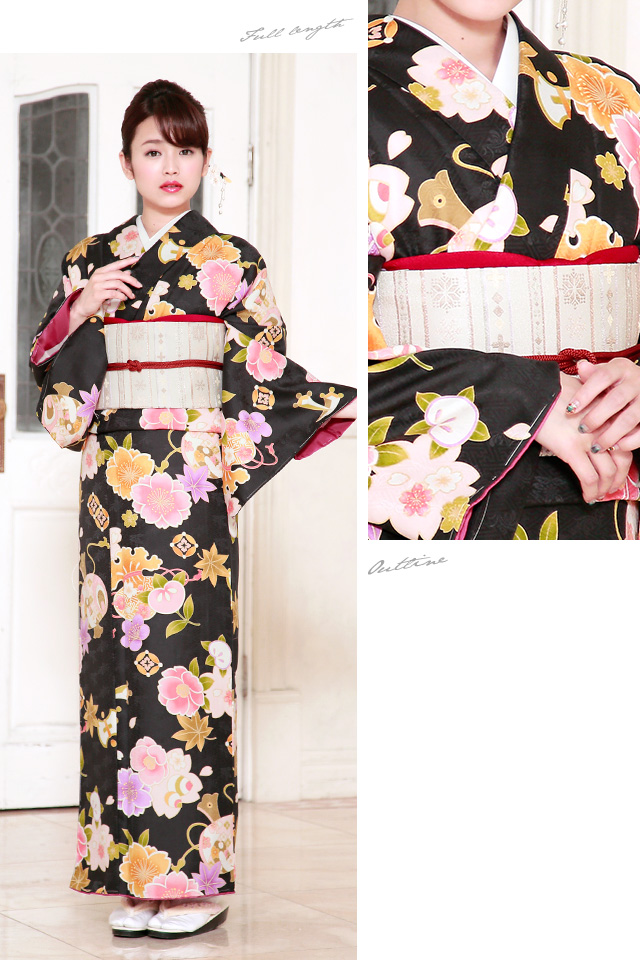 着物 洗える 洗える着物 袷 プレタ着物 bonheur saisons 黒 ブラック 桜 梅 橘 椿 紅葉 宝尽くし 小紋 ボヌールセゾン レディース きもの 仕立て上がり【送料無料】
