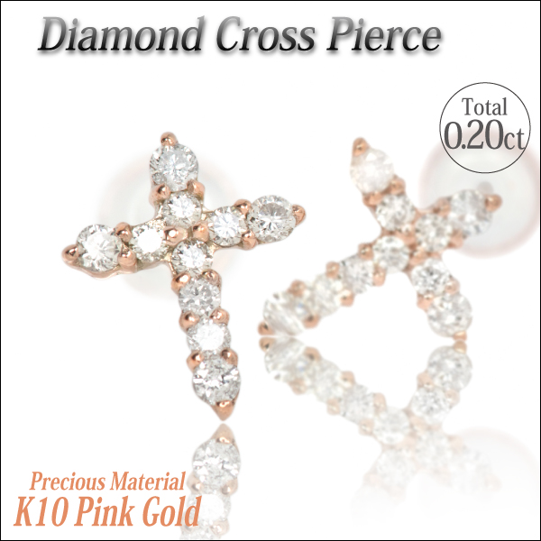 送料無料 K10 ピンクゴールド ダイヤモンド クロス ピアス 両耳トータル0.20ct 十字架 両耳ペア 宅配便