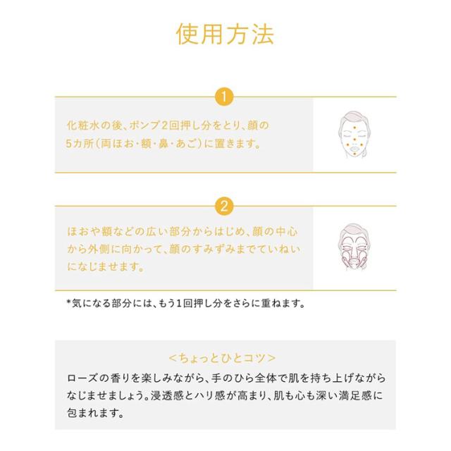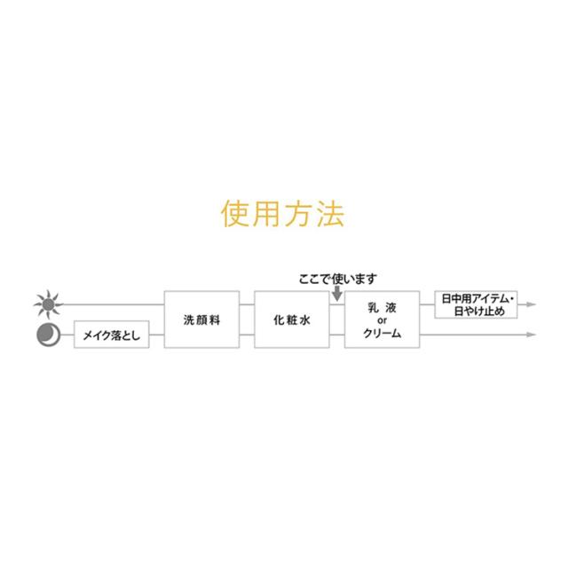 ・朝夜の化粧水の後、ポンプ2回押し分をとり、なじませます。気になる部分には、もう1回押し分をさらに重ねます。