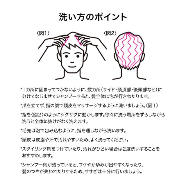 ・髪をぬらしてから適量を髪全体につけ、十分に泡立てながら頭皮をマッサージするように洗い、その後よくすすいでください。