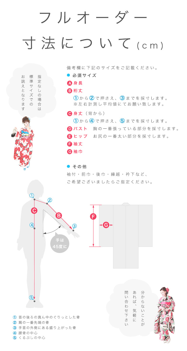 身長・身丈(背から)・裄丈・袖丈・袖巾・バスト・ヒップ