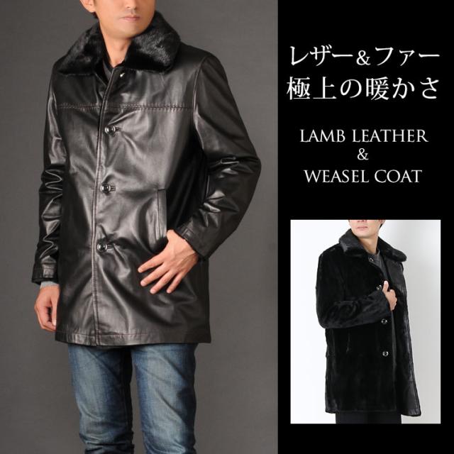 ●特長L〜3L/ファー付き/リバーシブル●デザイン ラム革&ウィーゼルのリバーシブルデザインのコート。風を通さないラムレザーに内側はウィーゼルの毛並みで極上の暖かさ。襟元のボリュームあるファーにはワイヤーが入っているのでしっかりとフォルムが決まります。●素材 レザー面には身体に馴染みやすい柔らかなラム革を使用。毛皮面には密に詰まって保温性抜群のウィーゼルを使用。襟元にはブラックミンクを使用、艶やかな光沢が大人の男らしさを演出。●スタイル極上の毛皮を贅沢使用しているので暖かさはもちろんゴージャスで紳士な装いに。