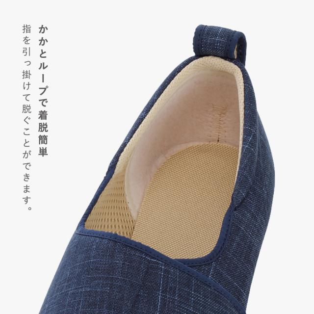 涼しげな印象のかすりの風合いが足元をかろやかに。内素材に通気性のよいメッシュを使用した「オープン和(なごみ)」施設用・院内用シューズです。